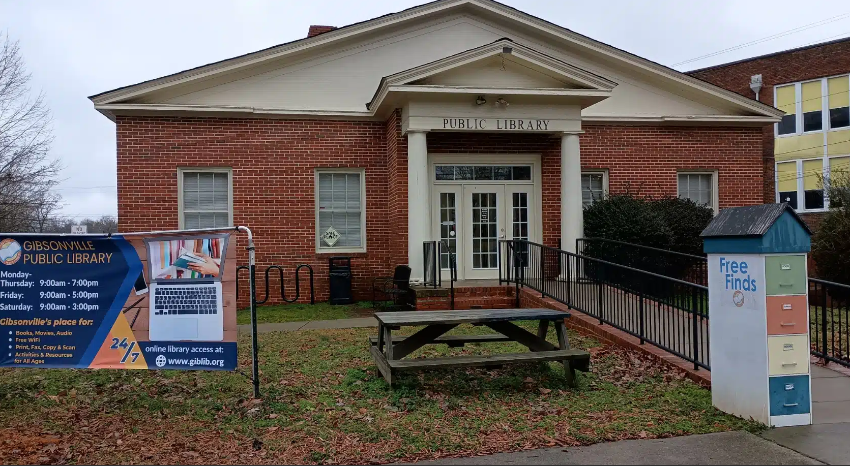 | Description | There is a Free Finds cabinet accessible 24/7 in front of the Gibsonville Public Library. There is also a small community pantry inside the library's lobby which is open during regular library hours. |