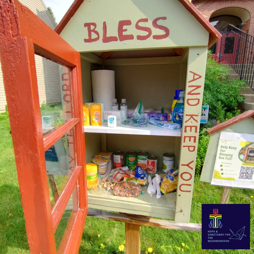 | Description | The Beloved Community Blessing Box has been an ongoing mission of Beloved Community Presbyterian Church since 2022. The Box is filled multiple times a day during the church's operating hours by staff with a focus on toiletry items (usually on the top shelf) and shelf stable food (usually on the bottom shelf). We encourage neighbors to also donate supplies by dropping them in the box or by bringing them to the church. |