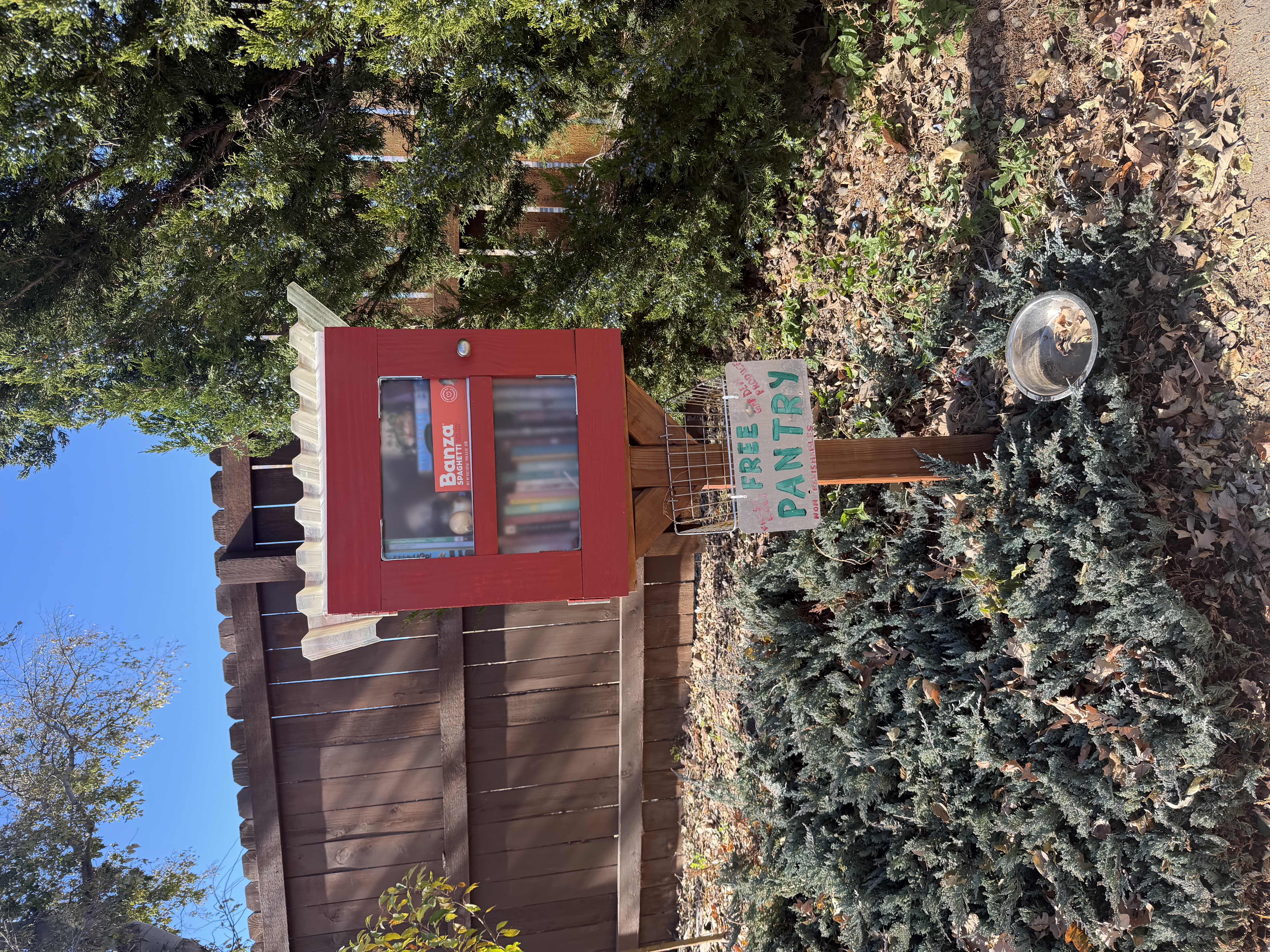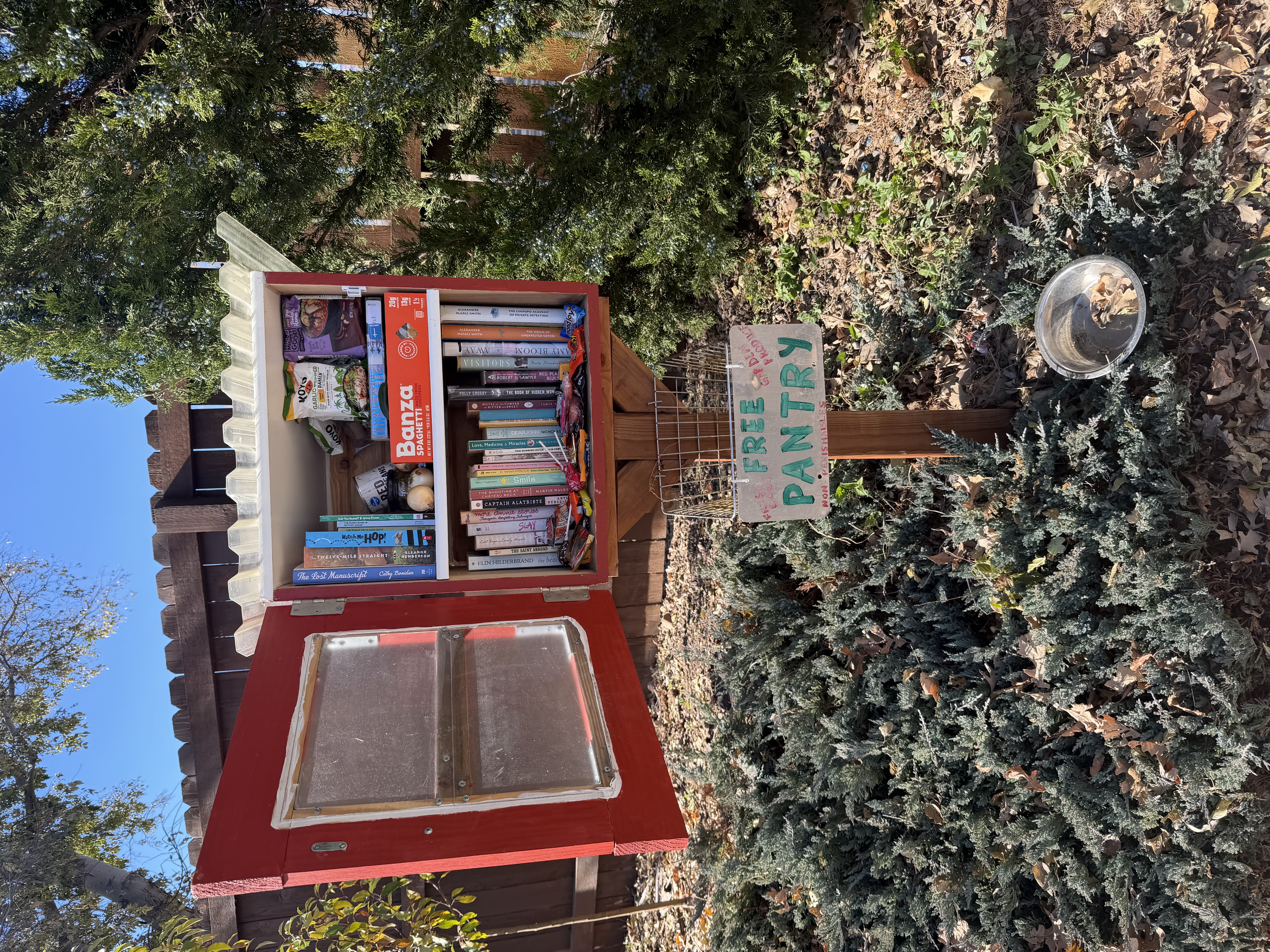 Come visit our little treasure library and pantry to take or leave some books, treasures, or food!
