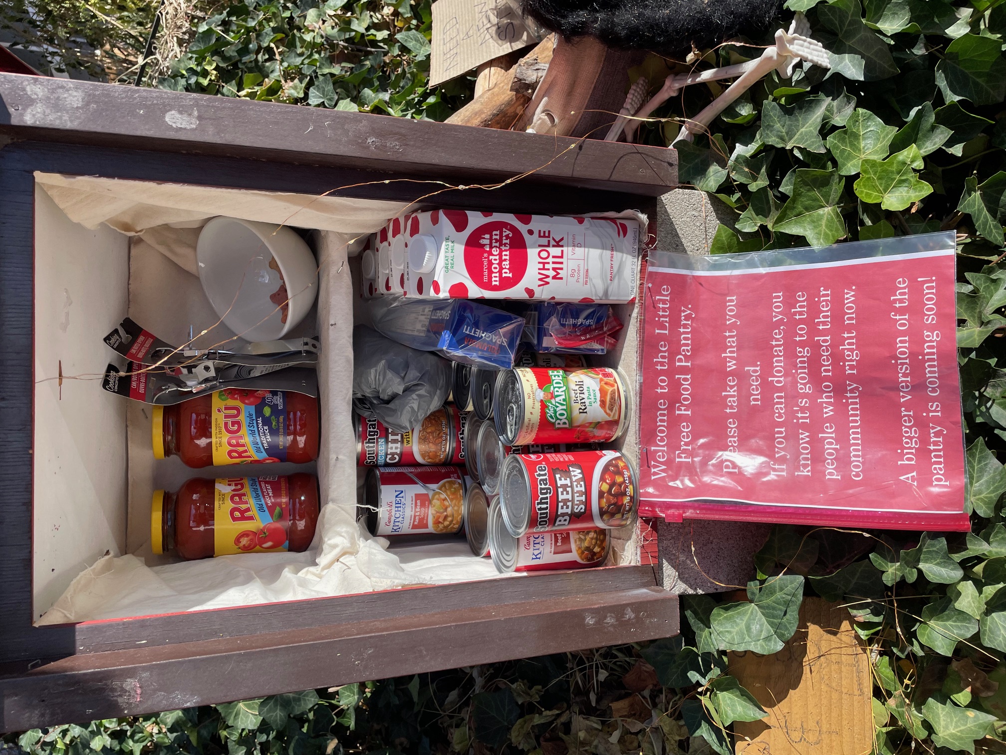 | Description | A small free food pantry, serving maybe eight to ten families a day. We hope to have a much larger secure box placed on-site by this weekend. |