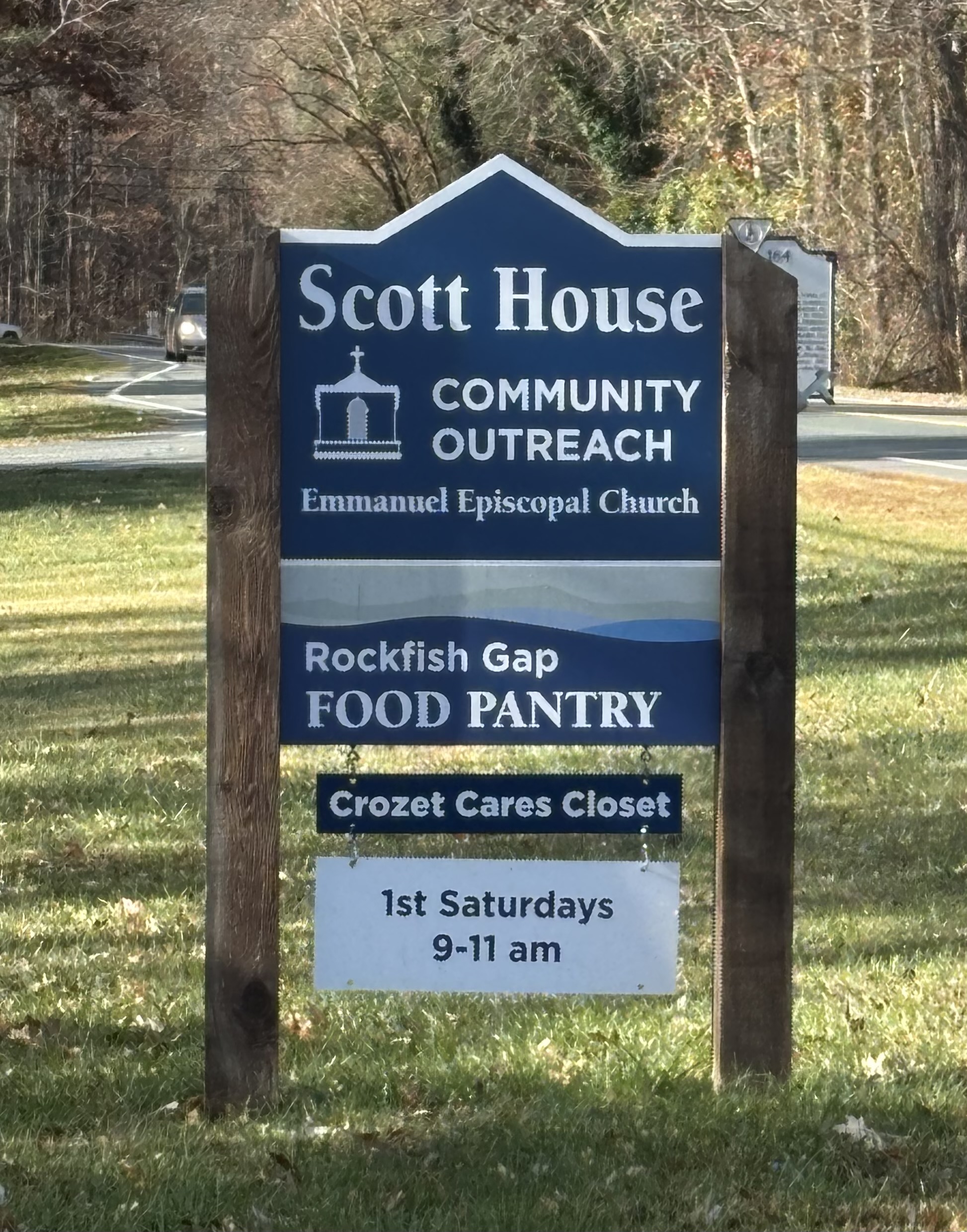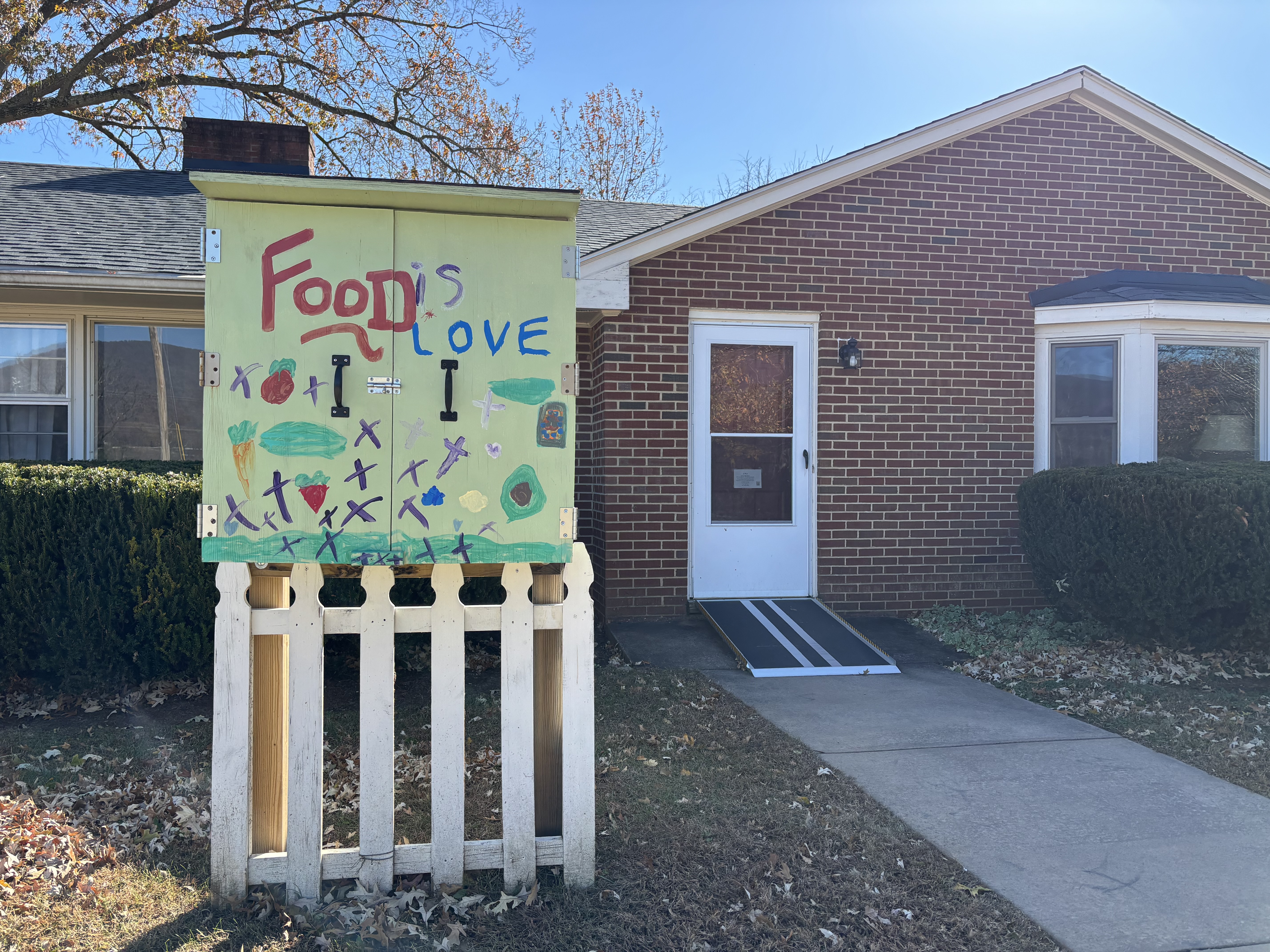 Green cupboard with “Food is Love” painted on it. Located at Scott House, the Emmanuel Greenwood Community Outreach building, a one-story brick house. Open latch at bottom of box before opening latch at front. The Rockfish Gap Food Pantry, Crozet Cares Closet and Scott Shop take place here the first Saturday of every month, from 9-11am. All are welcome! |
