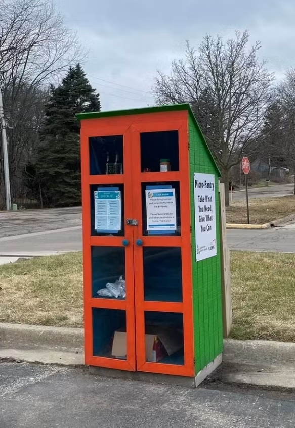 Pantry located in parking lot of Haslett library. Some items are taken into library lobby during cold spells to prevent freezing.