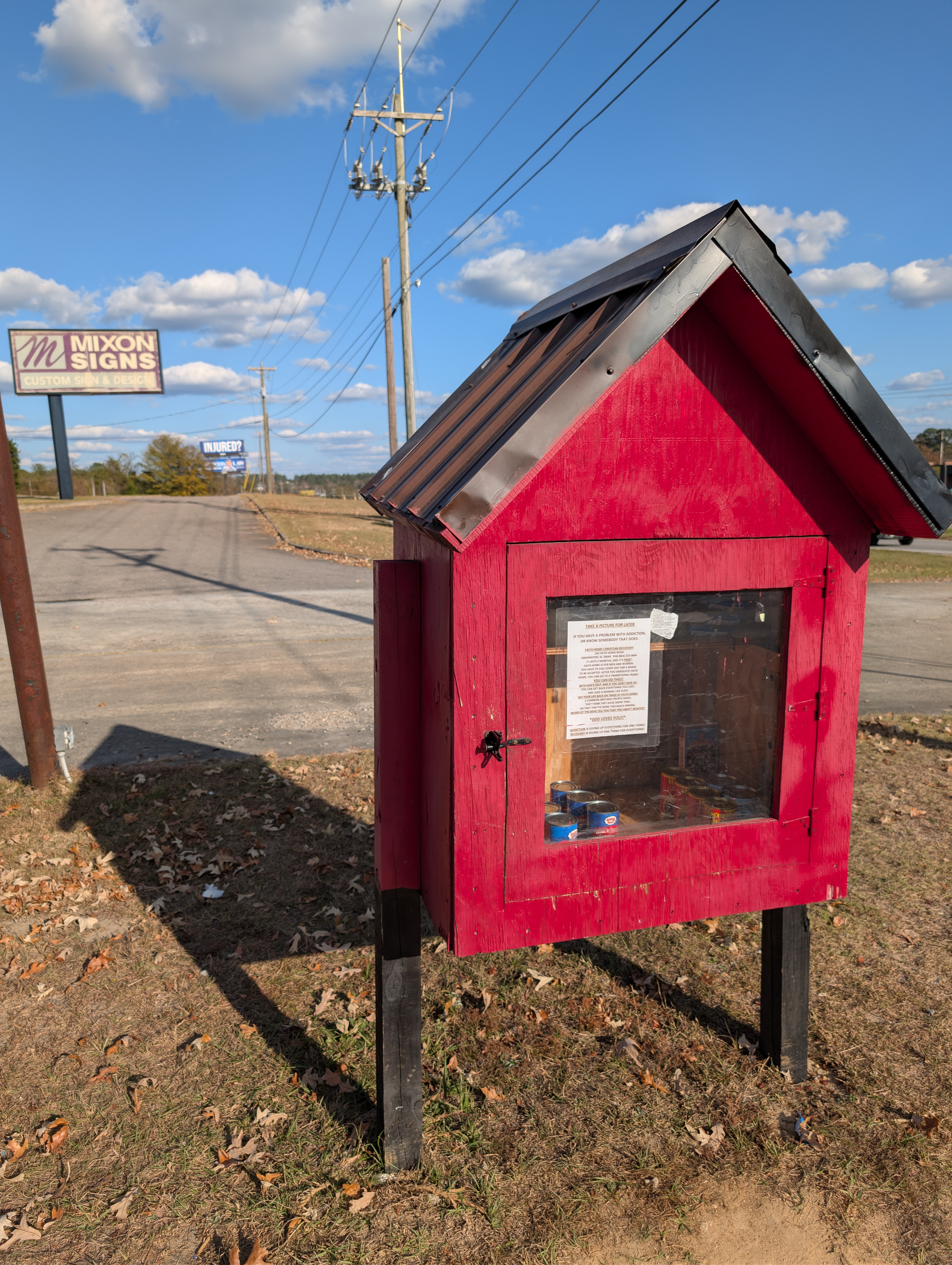 | Description | A large red pantry that — when stocked by well-meaning neighbors — has food, books, movies, and possibly more. |