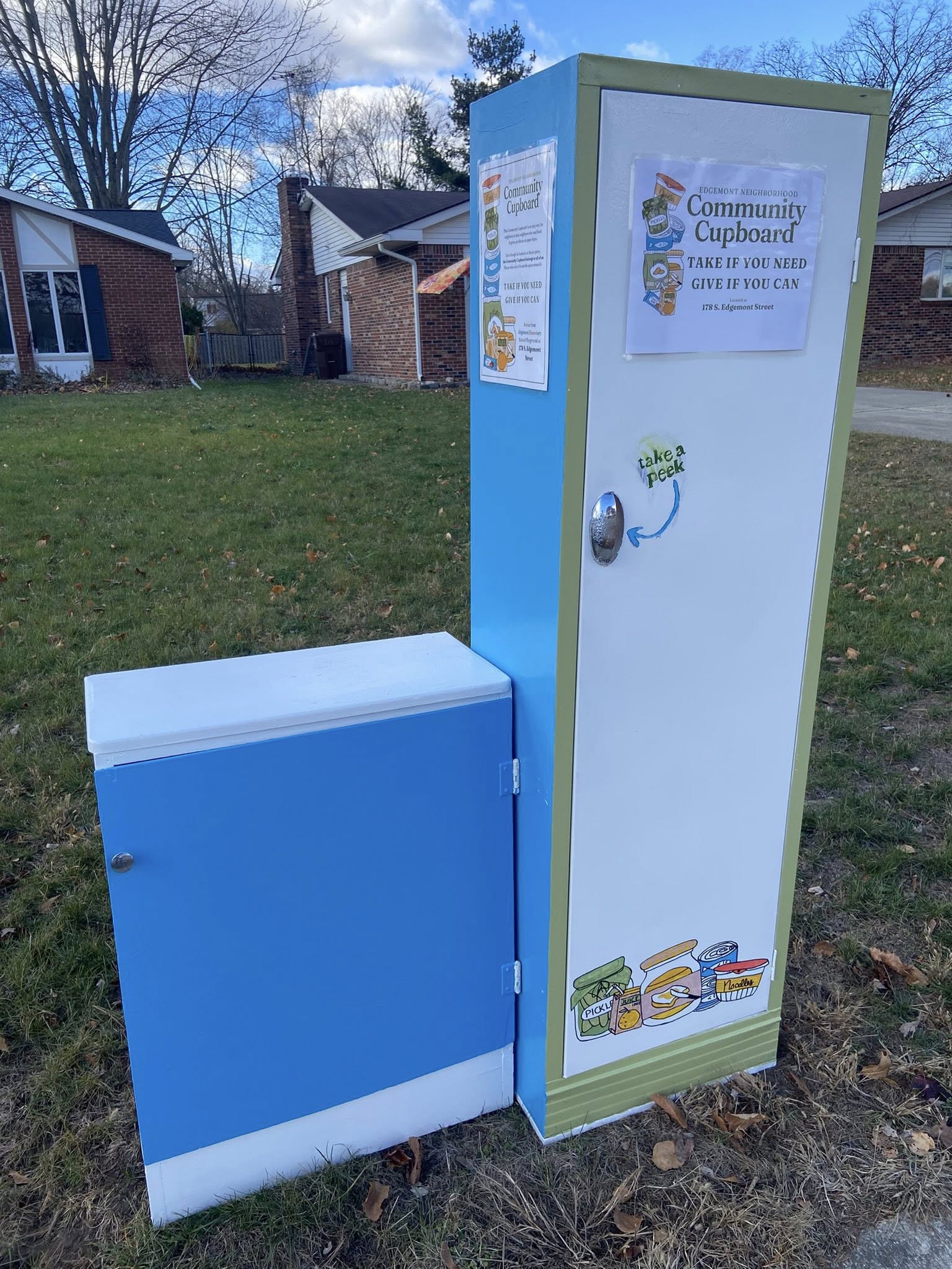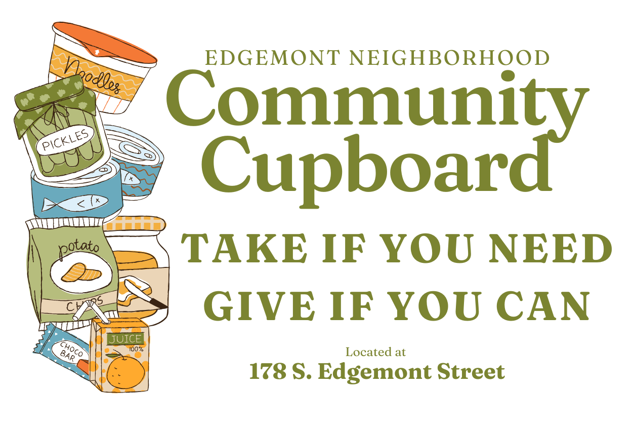 This Community Cupboard is an easy way for neighbors to help neighbors who need food, hygiene products, or paper items. It is a shared neighborhood space where anyone can take what they need or offer what they can. The Community Cupboard belongs to all of us. Take freely, no questions asked. Give unexpired, sealed food and other items your own household uses. Help keep the space tidy. |