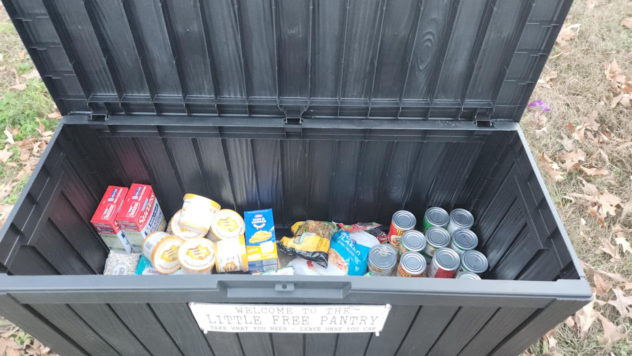| Description | Brown parcel box with little free pantry sign on it. At end of the road, near our mailbox. Leave what you can, take what you need. Free. |