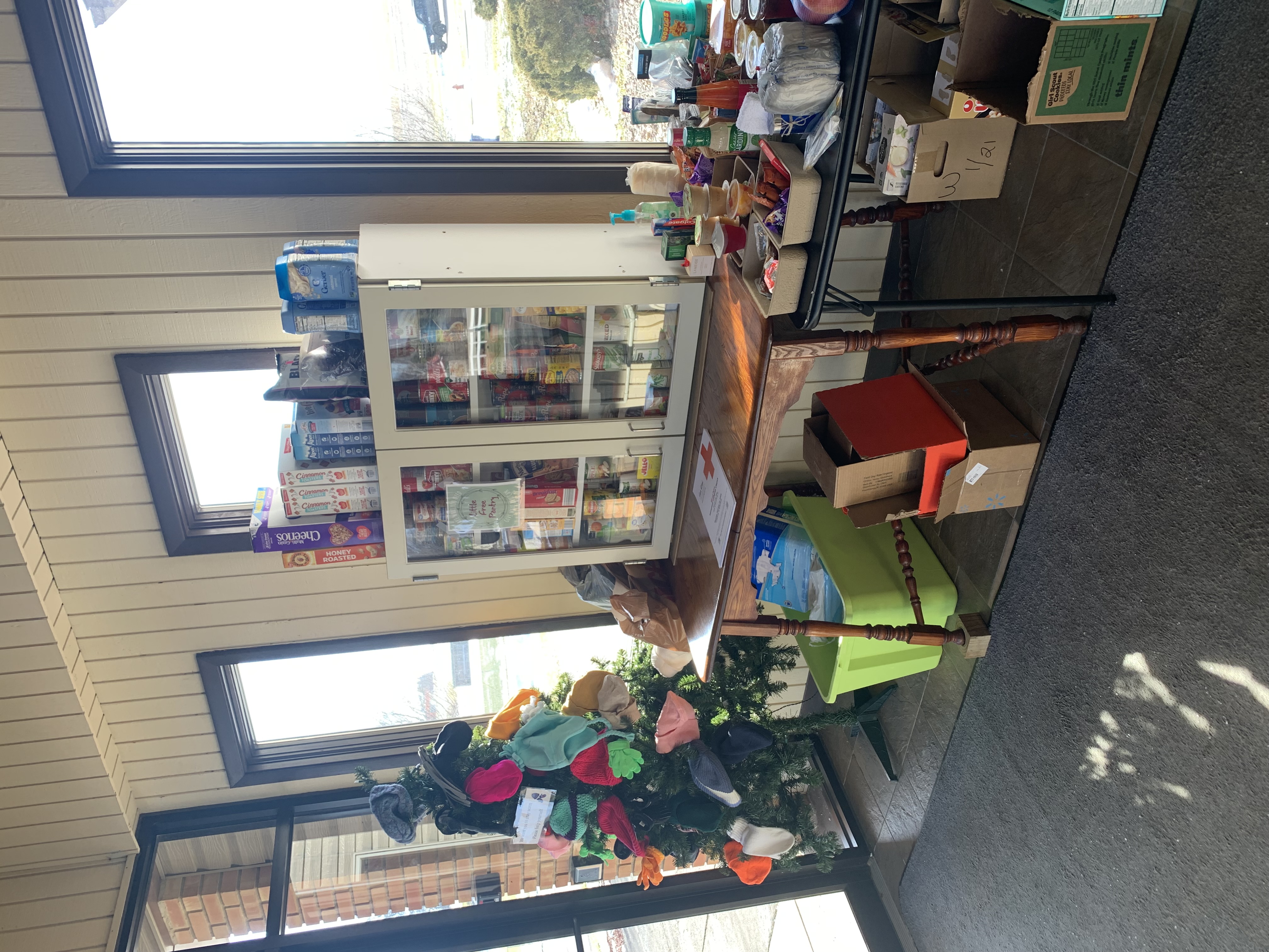 Pantry is located in entryway and filled by community members. 24/7 access.