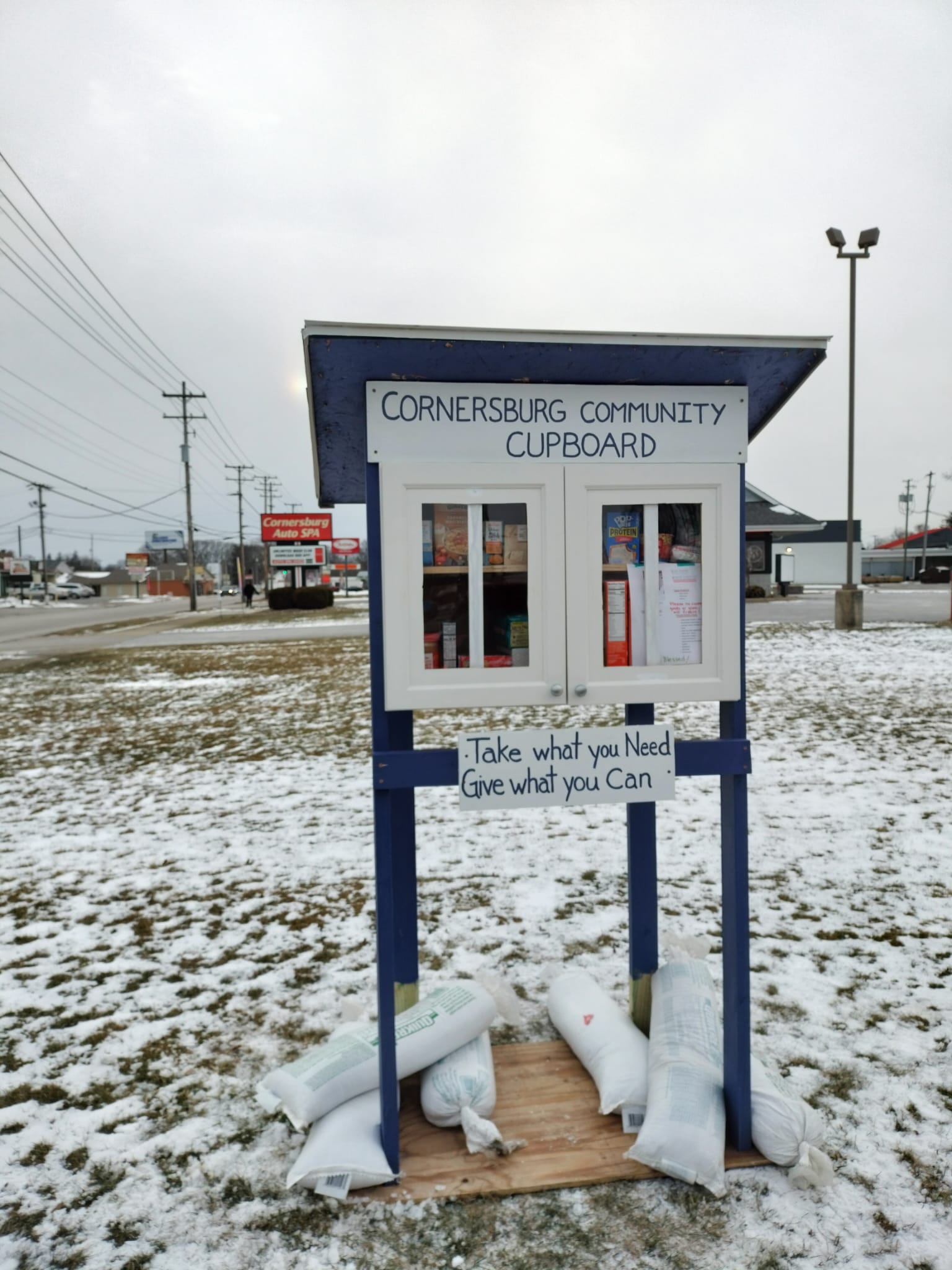 | Description | Little Free Pantry available for the community on Zion Lutheran Church property. Located near the sidewalk. Maintained by members of the church. It is a retrofitted kitchen cupboard with 4 legs and a roof. Currently it is attached to a base and is weighted down with sandbags. When the weather warms, the legs will be dug into the ground. |