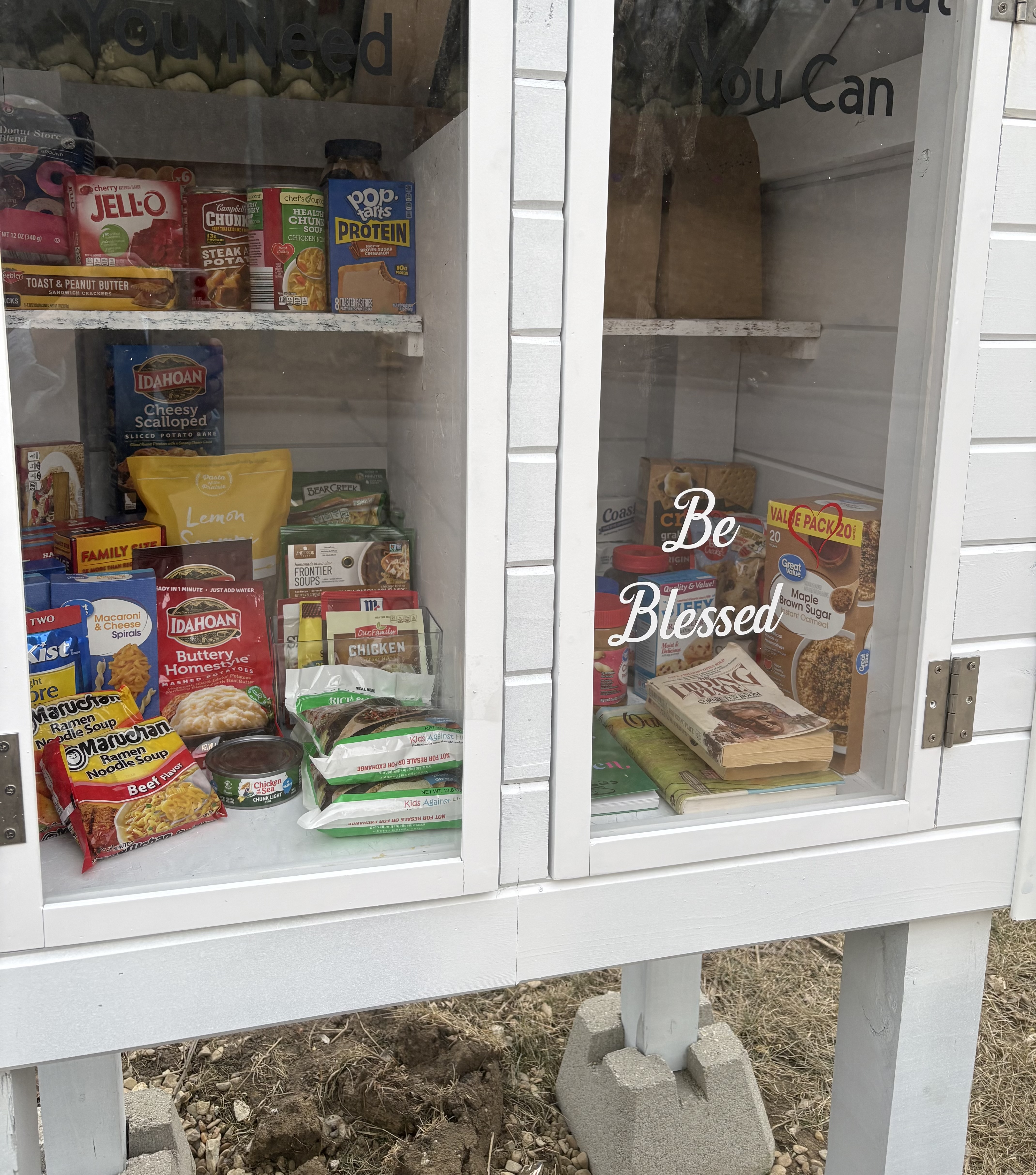 A community resource for those in need and those with the need to give. Stocked with shelf-stable foods, toiletries, snacks, and books. Available 24/7. Sidewalk access. If you cannot feed 100 people, Feed Just One. ~Mother Teresa |